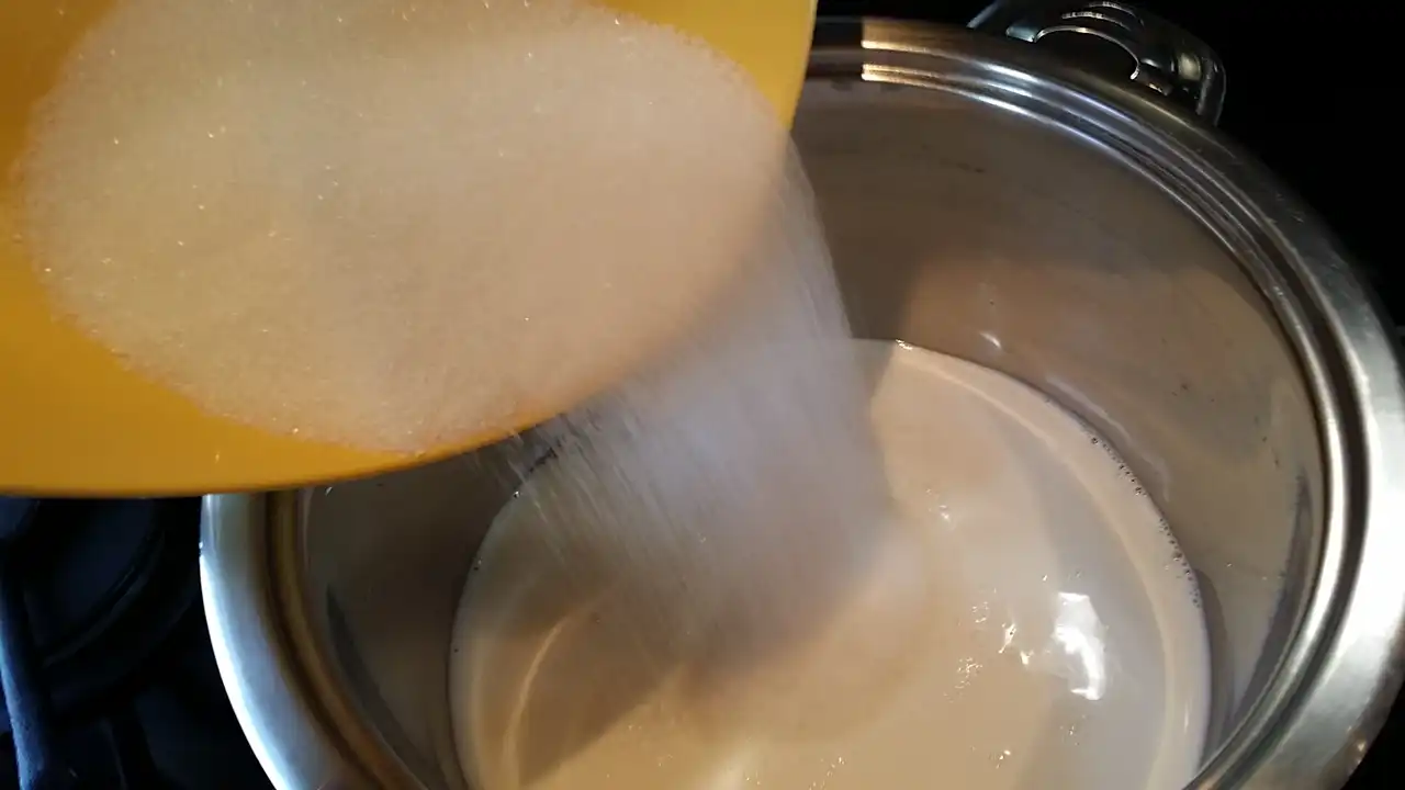 u dubljoj šerpi stavite mleko i šećer, pa na tihoj vatri ostavite da se šečer otopi.
