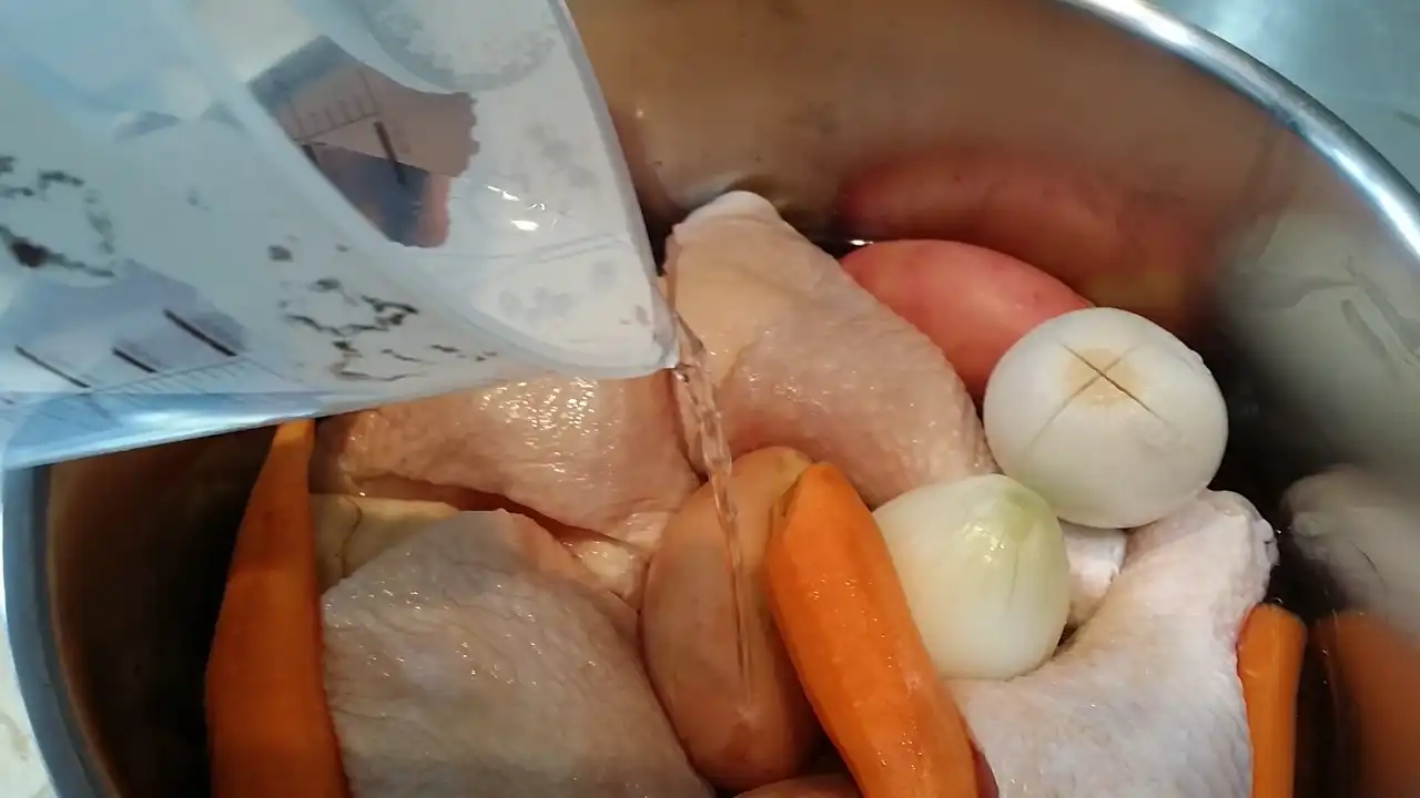 Sve zajedno preliti vodom tako da meso i povrće budu potpuno prekriveni.