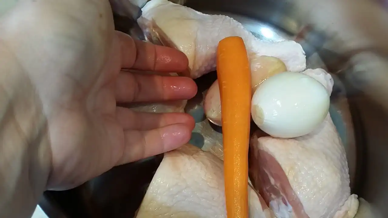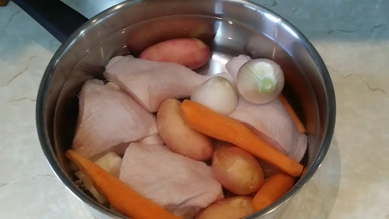 Pileći rinflajš uvek pravim sa puno strpljenja. Meso dobro operem, isekom na komade koje volim, i složim u šerpu zajedno sa sveže očišćenim krompirom, šargarepom, lukom i ostalim povrćem iz recepta. Važno mi je da sve bude u dovoljnoj količini tečnosti da se meso krčka polako i ravnomerno, jer tek tada dobije svoj prepoznatljivi, prirodni ukus.