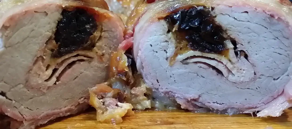 Svinjski rolat fileta sa pečenicom, sirom i suvim šljivama, u omotu od slanine