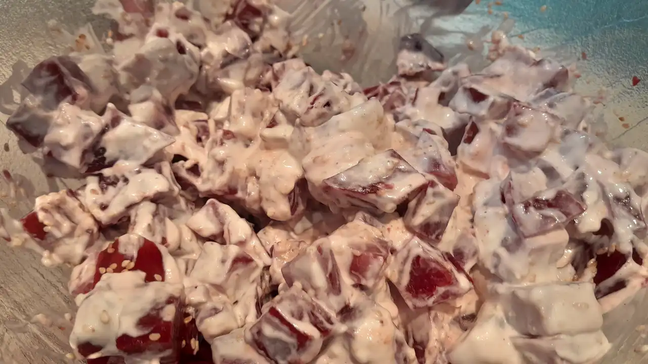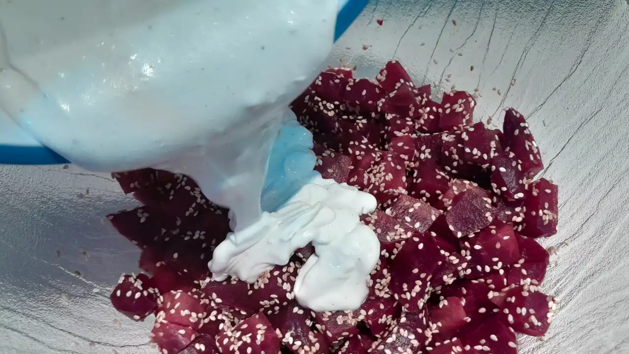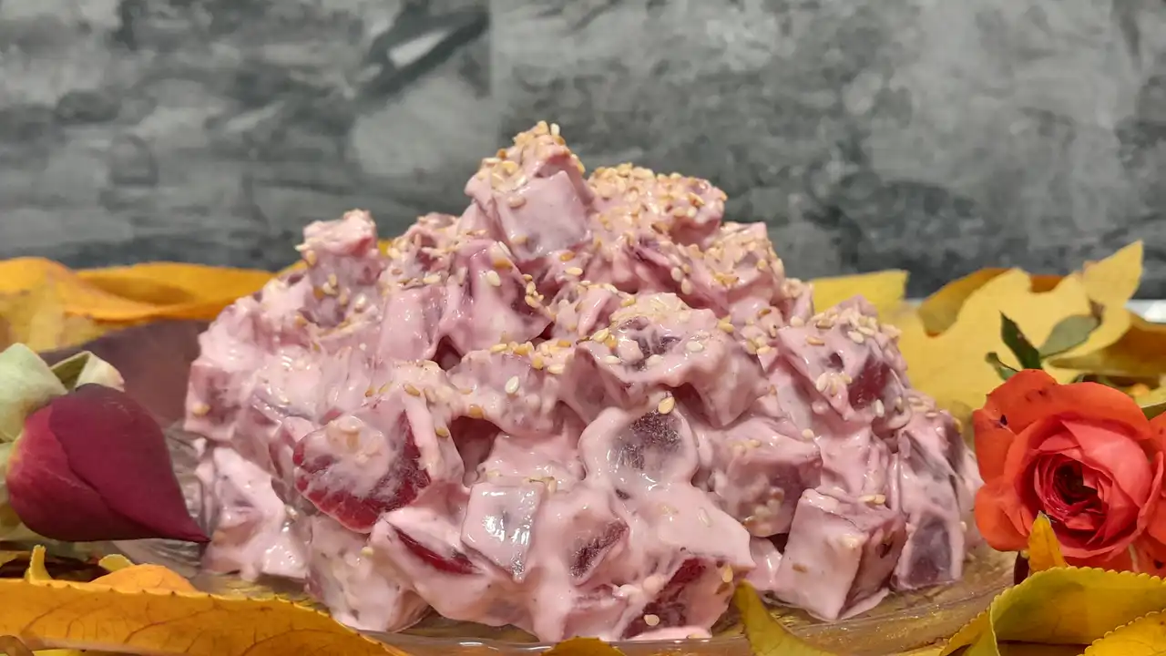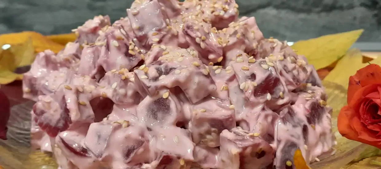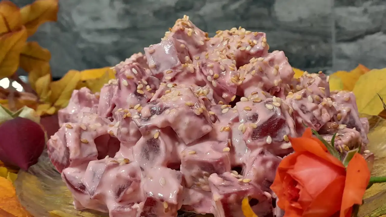 Priznaću vam jednu stvar – nisam planirala ništa komplikovano. Samo sam htela da od mamine crvene cvekle napravim nešto što može da se pomeša i osveži, ali da ne bude dosadno kao stare priče. Pa sam rekla: “Šta ako susam prepečem da miriše i krcka dok ga jedemo?” I bum, kocka je pala -malena jesenja čarolija se desila! Dodala sam kremasti preliv od pavlake i majoneza, malo soli i bibera, i dobila recept koji sad stalno pravim kad poželim nešto veselo i ukusno, a bez muke.