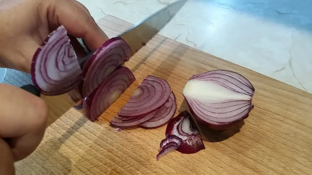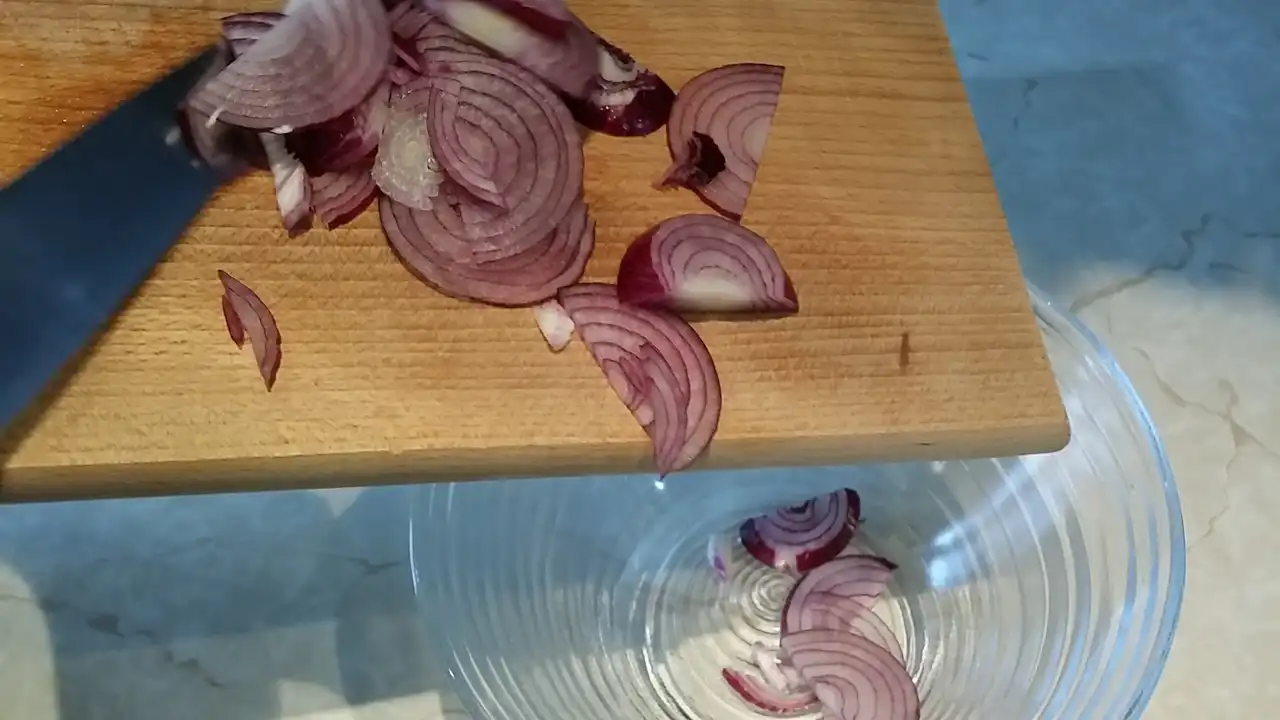 - Crveni luk – Jedan blagi, ali aromatični luk seči se na tanke polukolutove da ne dominira, već da nežno upotpuni svežinu.