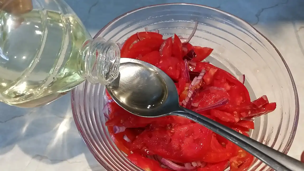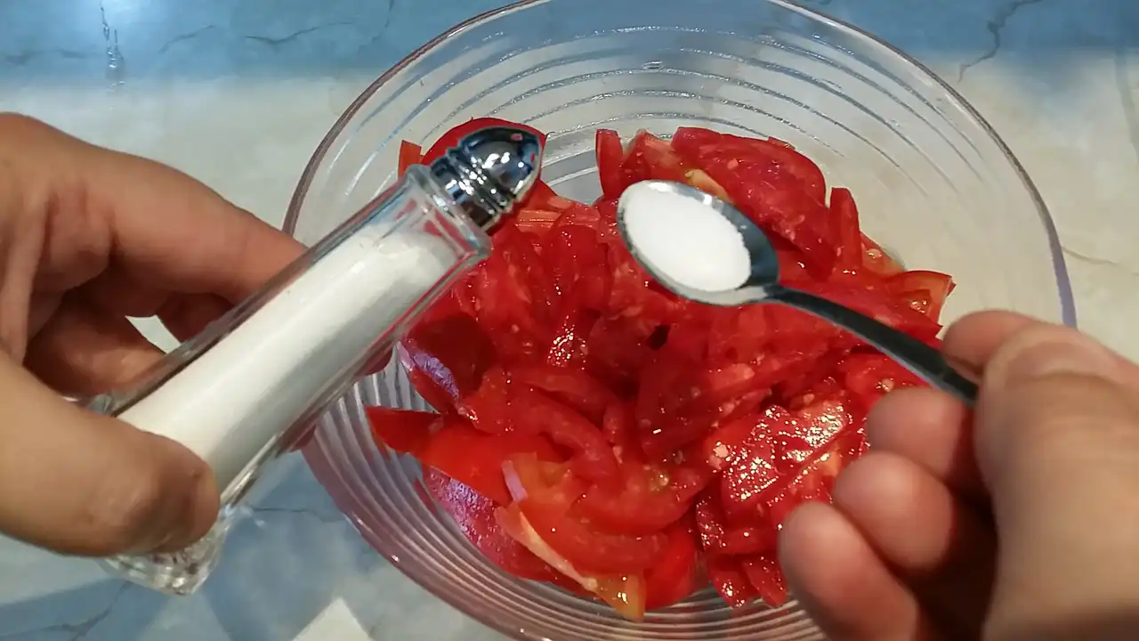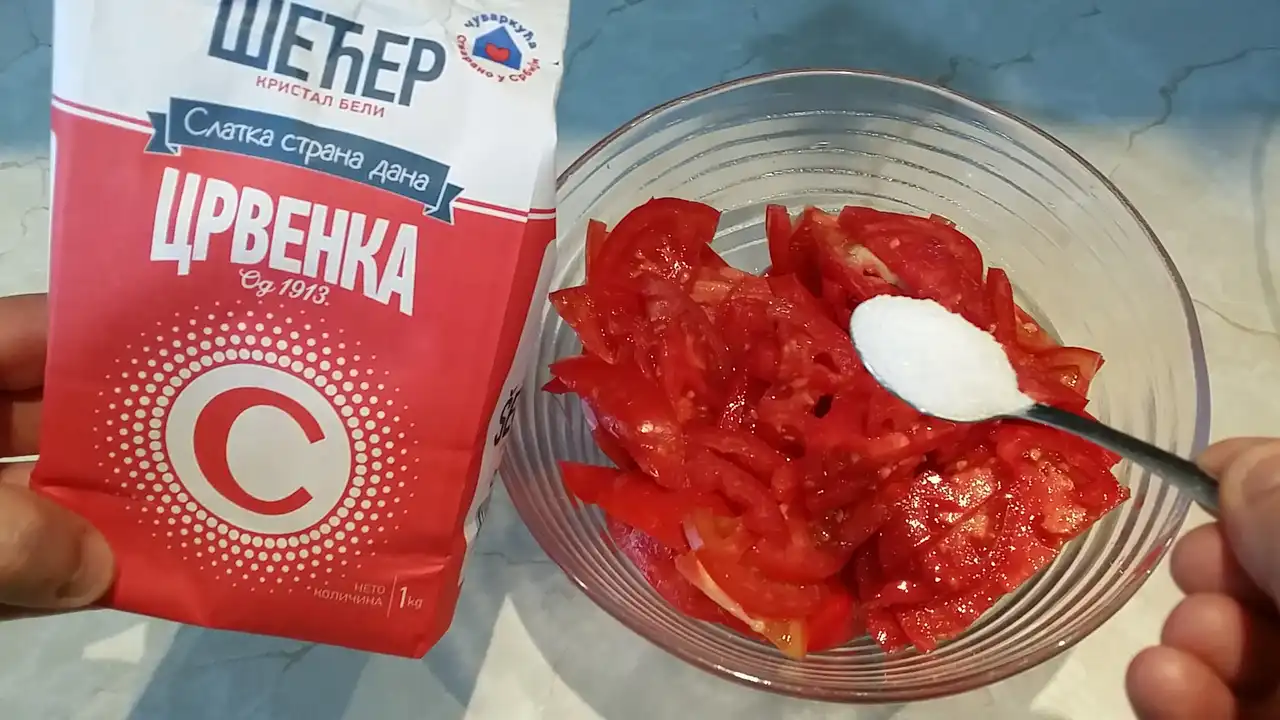 Sečem paradajz na debele polukolutove, jer volim kad svaki zalogaj ima tu puninu i sočnost. Luk seče na tanke listove, da ne preplavi salatu već da je dopuni blagim ukusom. Šećer ubacim da istakne slatkoću paradajza, a so da sve okrene na pravi ukus. Ulje da sve to poveže u jednu skladnu priču. Veruj mi, preskočiću komplikacije, ovde je najbitnije btzina, jer je ovo jako brza salata sa malo sastojaka.