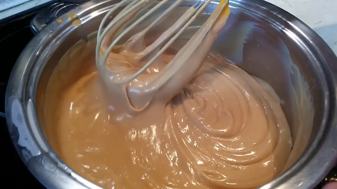 Sada u tu karamel masu umešajte pripremljeni puding i mešajte neprekidno, da se ne stvore grudvice, dok se krem ne zgusne onako kako volite.
