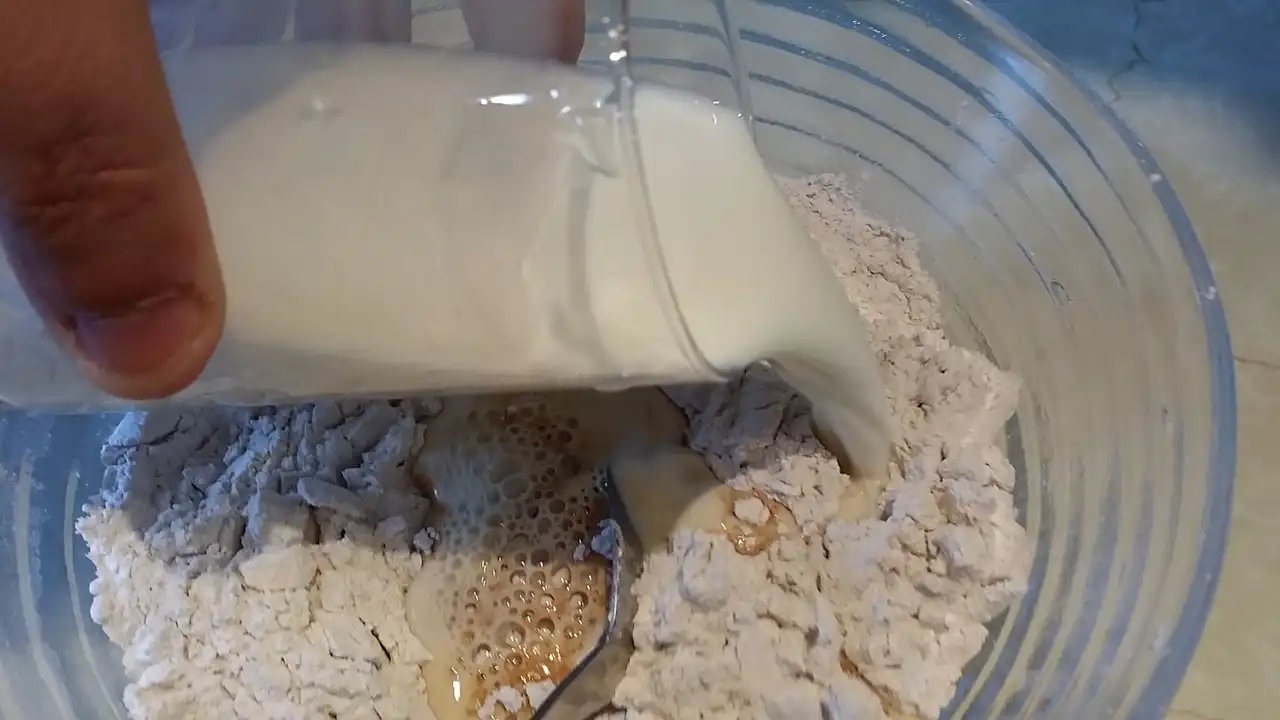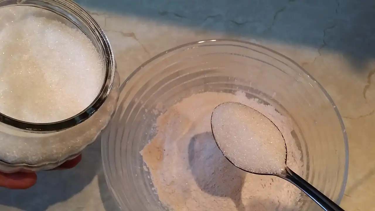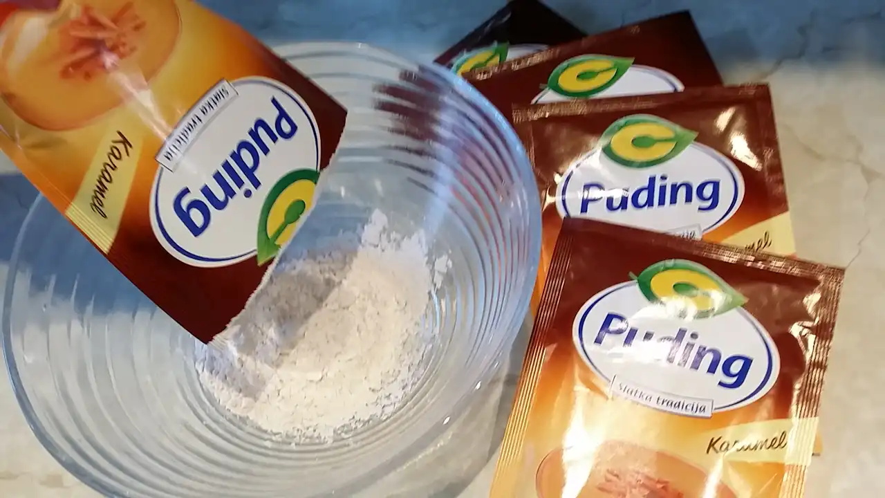 U dublju posudu stavite prašak za puding i 2 kašike šećera, pa im dodajte 2 decilitra mleka. Dobro promešajte da ne ostane ni jedna grudvica, pa ostavite sa strane.
